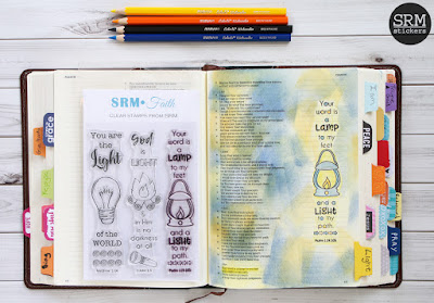 For this page I used SRM's Bible Margins Light Stamp Set and Color In Pencils, as well as black, yellow, blue, and orange ink, and temporary adhesive.